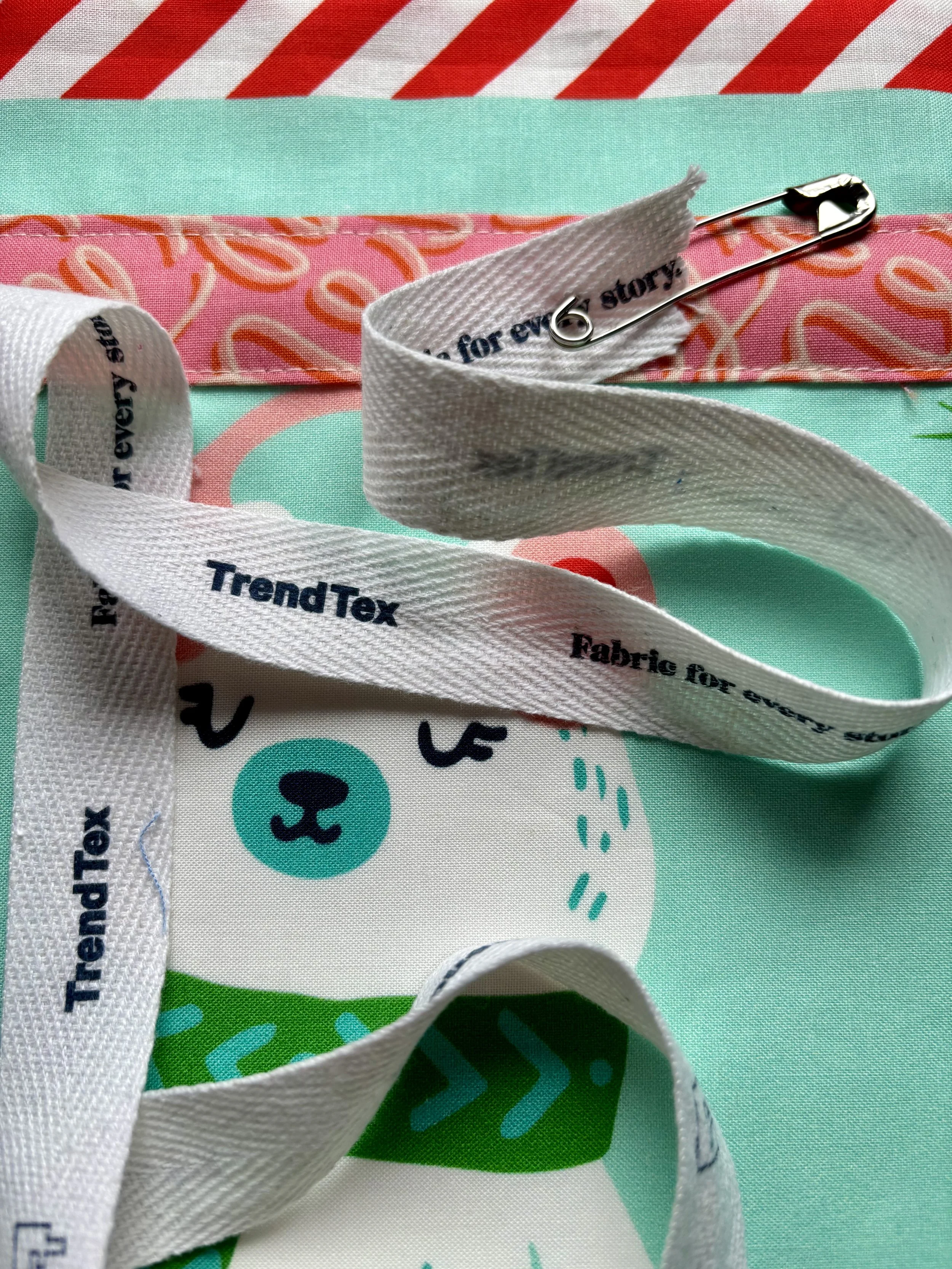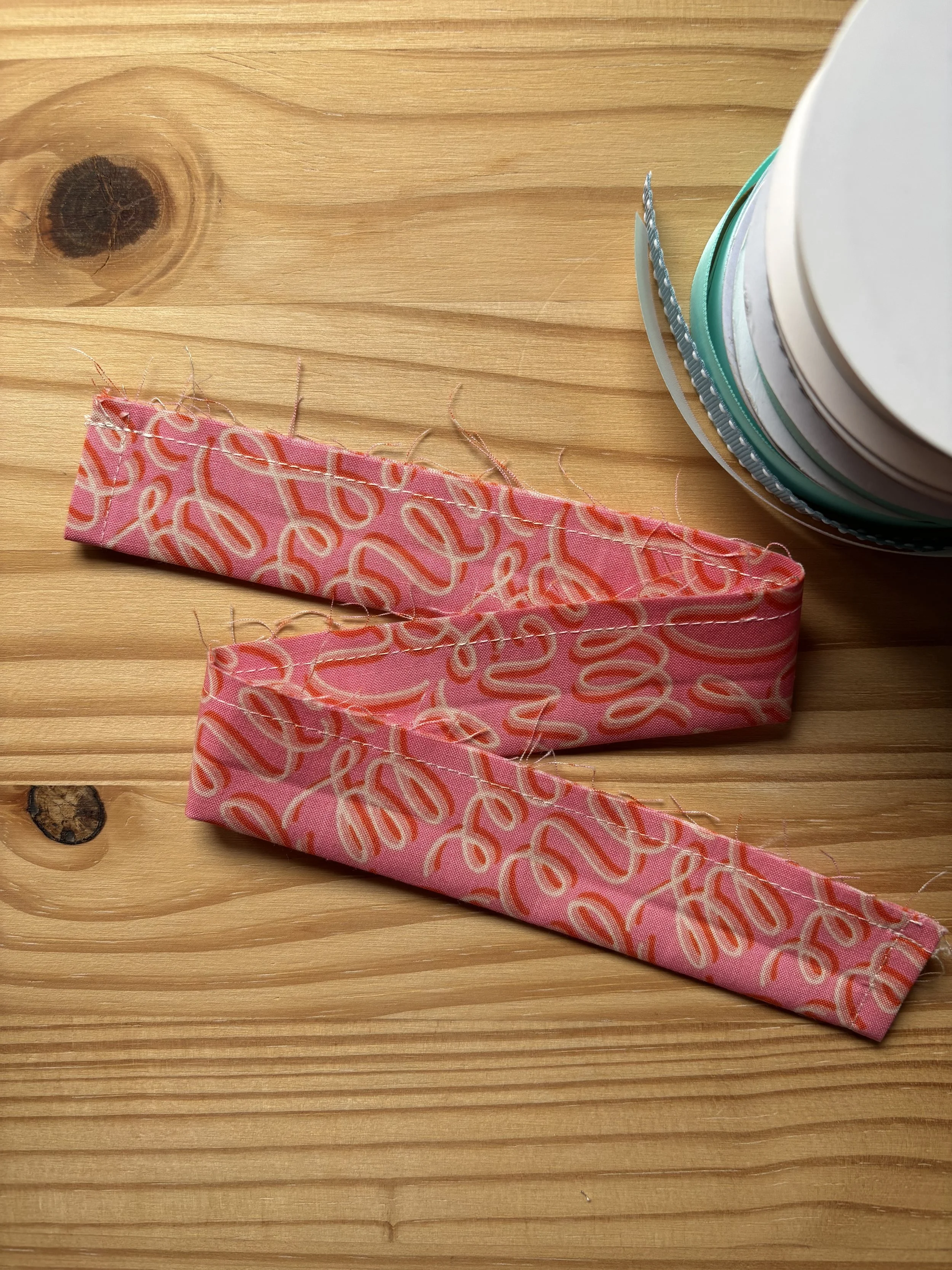 Finish each end of the casing strip by folding over each end (roughly ¼ inch) two times and edgestitching. (The casing is meant to be narrower than the body and lining fabric widths once hemmed)