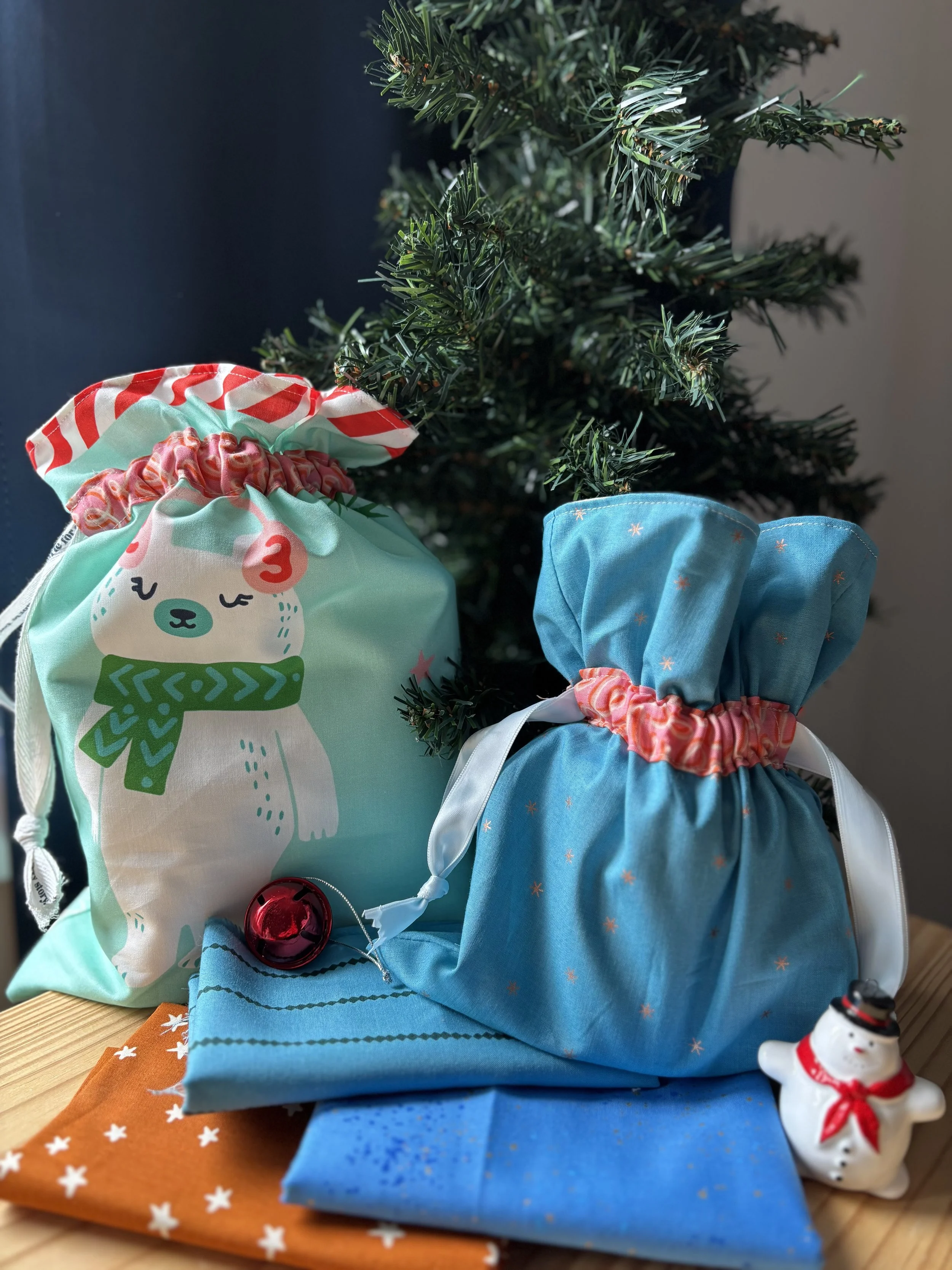 Out with disposable gift wrap and in with these quick and easy lined drawstring gift bags. Spend the afternoon whipping up a handful of fun and reusable gift bags for the holidays. This is a great scrappy project or buy that Christmas fabric you’ve been eyeing, they’re going to look great either way!